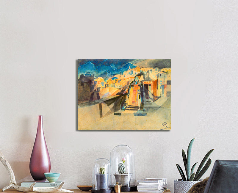 Gaganendranath Tagore's "Dwarkapuri" is a modernist interpretation of the sacred city of Dwarka. The painting's abstract composition and bold use of colors convey a sense of spiritual depth and artistic innovation.