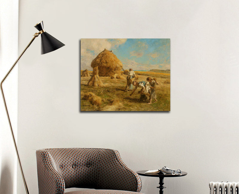 Gleaning Women by Léon Augustin Lhermitte portrays a group of women collecting leftover grains in a field after the harvest. The painting exemplifies Lhermitte’s commitment to Realism, focusing on the dignity and labor of rural life. The women are depicted with strong, muscular figures, their toil in the sun highlighted by rich tones and a sense of motion. Lhermitte’s emphasis on the textures of the earth and the human form conveys a deep respect for the working class and the rhythms of agricultural life.
