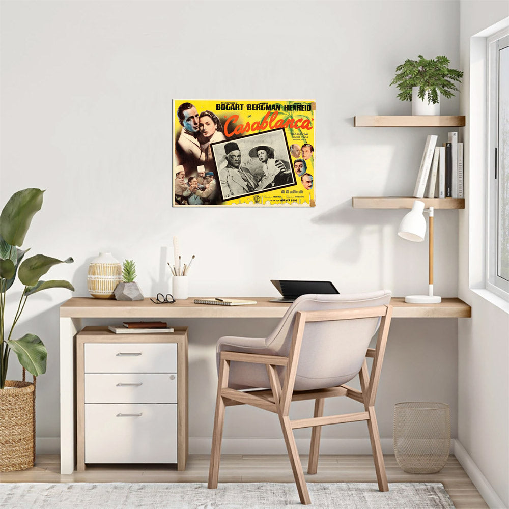 This Mexican reprint of Casablanca (1942) features vibrant artwork, bringing out the romance and drama of the classic film, while showcasing unique design elements reflective of Mexican poster art.