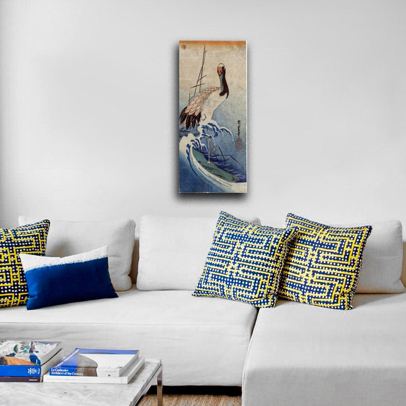 Crane in Waves by Hiroshige is a striking ukiyo-e print that masterfully captures the beauty of the crane amidst the dynamic movement of waves. The flowing lines of the waves contrast with the stillness of the crane, symbolizing the balance between tranquility and motion. Hiroshige’s use of color and design reflects the natural harmony of the bird’s environment.