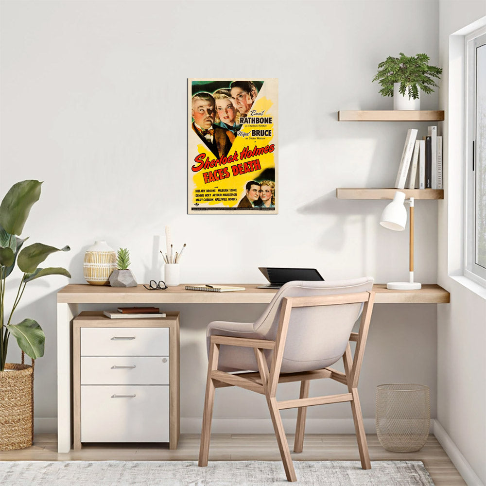 This reprint of Sherlock Holmes Faces Death (1943), a mystery film featuring Basil Rathbone, features intriguing artwork reflecting the suspense and detective work at the heart of the story.