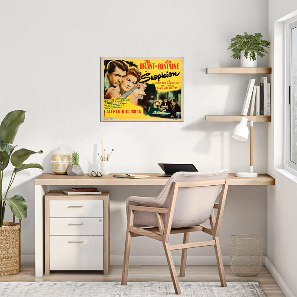 This Style B reprint of Suspicion (1941), a Hitchcock thriller starring Cary Grant and Joan Fontaine, features suspenseful artwork that captures the film's psychological tension and intrigue.