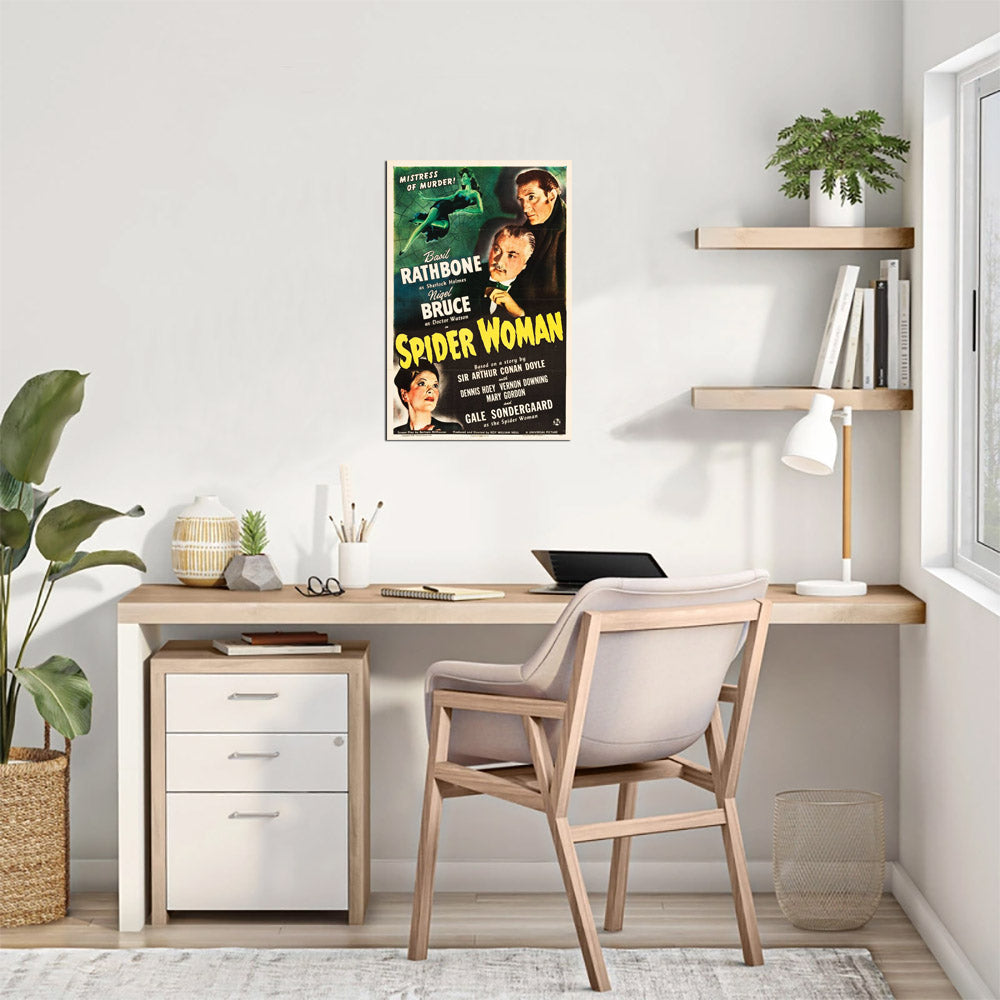 This reprint of The Spider Woman (1944), a mystery film starring Basil Rathbone and Nigel Bruce, features dramatic artwork that evokes the film’s thrilling detective noir atmosphere.