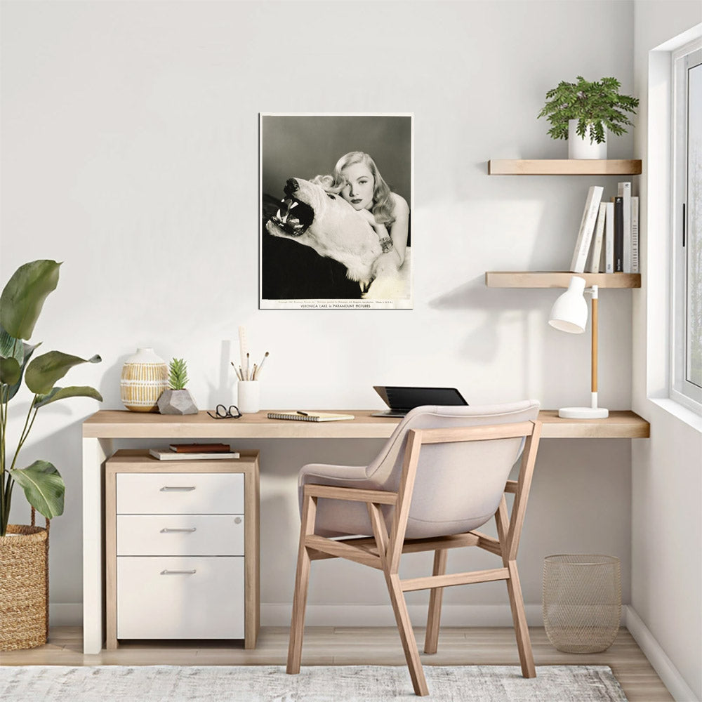 This reprint of a stunning portrait still of Veronica Lake, captured by renowned photographer George Hurrell in 1941, showcases the actress's sultry allure and glamorous persona in high contrast black-and-white photography.