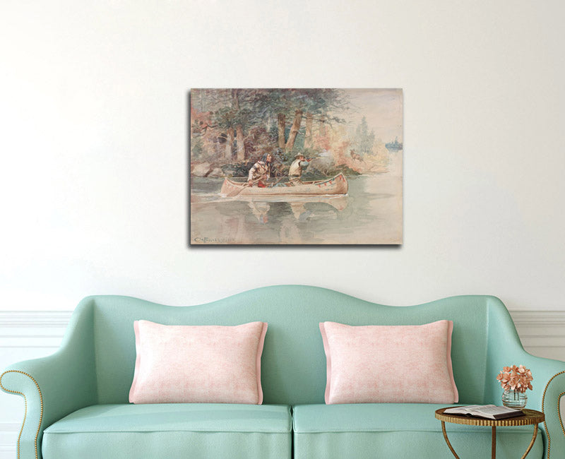 Charles Marion Russell’s "Caught Napping" humorously depicts a cowboy momentarily off guard, surrounded by prairie scenery. Russell’s characteristic style brings warmth and wit to this slice of Western life.