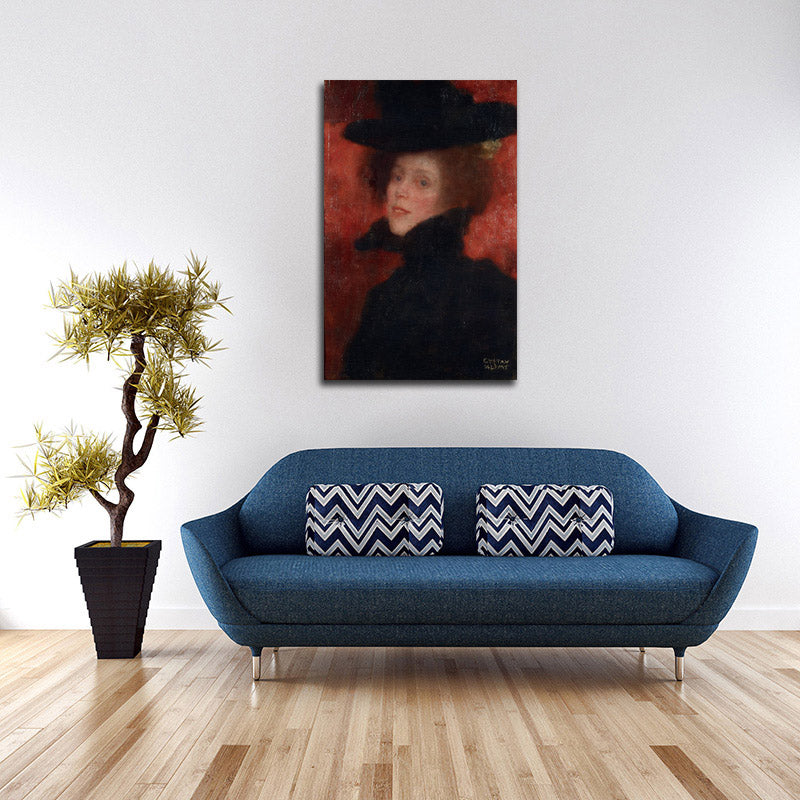 Lady with Cape and Hat in Front of Red Background - by Gustav Klimt