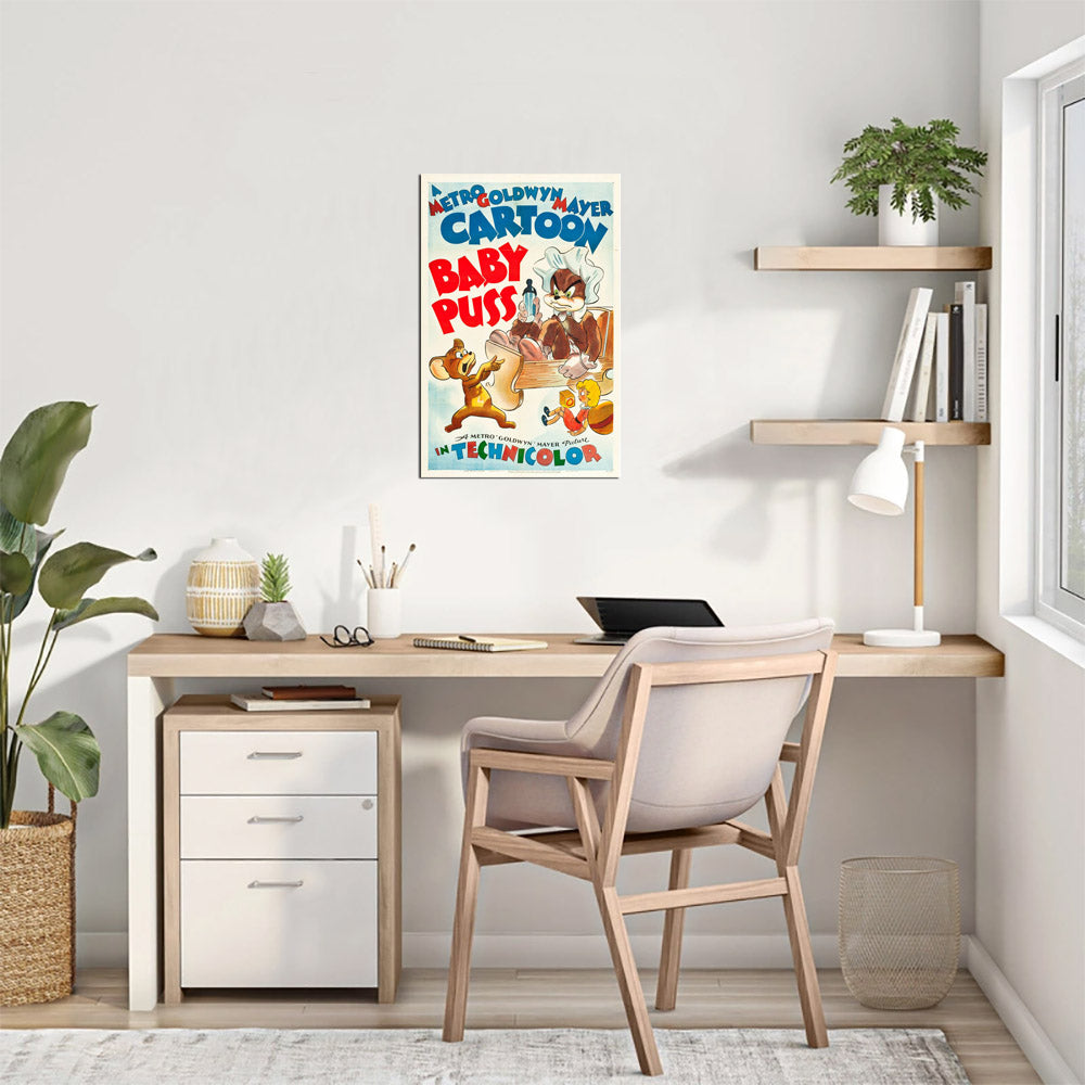This reprint of Baby Puss (1943), a Tom and Jerry animated short, features fun and colorful artwork that captures the classic antics of the beloved cartoon characters. The poster showcases Tom and Jerry’s misadventures as they try to outwit each other in this delightful short.