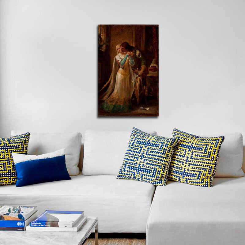 Pedro Américo's Fausto e Margarida depicts a dramatic scene inspired by Goethe's Faust. The painting's meticulous detail and emotive characters reflect Américo's mastery in capturing intense romanticism and literary themes.