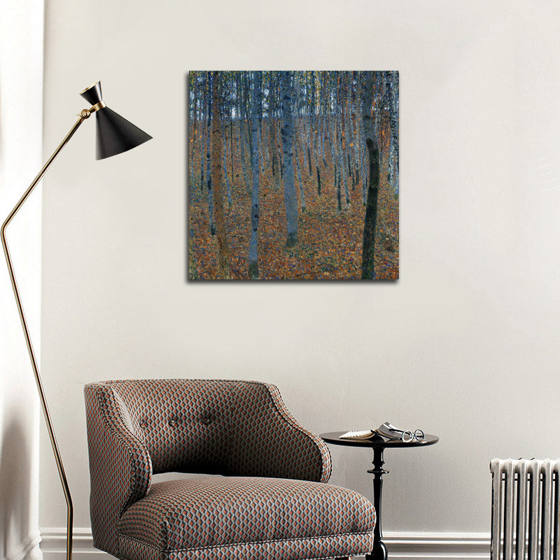 Beech Grove I by Gustav Klimt is a captivating landscape that showcases the artist’s departure from his famous figurative works to focus on nature. The dense, almost abstract composition of beech trees creates a rhythmic pattern, with Klimt’s use of color and texture bringing the forest to life. The golden hues of the leaves and the filtered light through the trees evoke a sense of tranquility and timelessness. Klimt’s attention to detail and his unique decorative style make this painting both visually complex and emotionally resonant, offering a glimpse into the beauty of the natural world.