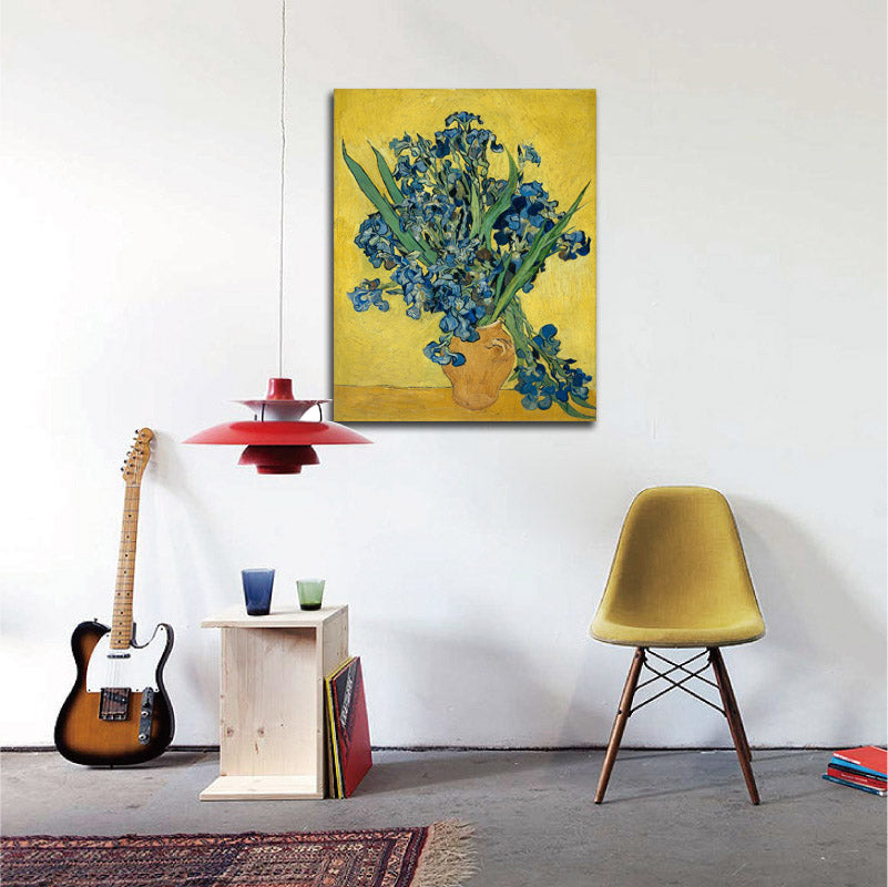 Bring the vibrant energy and striking colors of Vincent van Gogh's "Irises" into your home or office with our high-quality art print on papers and canvas prints. Painted in 1889, this masterpiece showcases the artist's exceptional use of color and dynamic brushstrokes, capturing the delicate beauty of irises against a bold yellow background. The contrast of the vivid blue flowers and the warm yellow backdrop creates a visually stunning piece that will brighten any room.